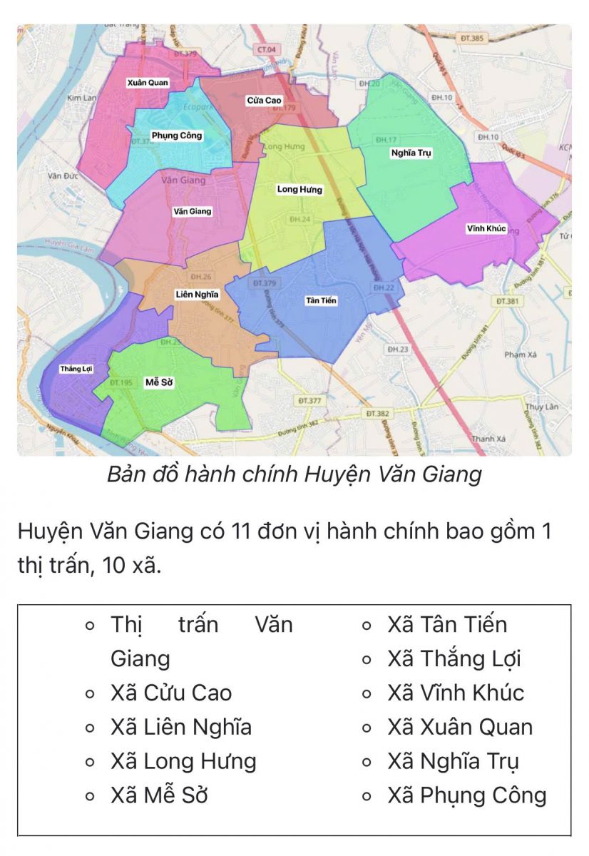 Huyện Văn Giang Hưng Yên: các xã Nghĩa Trụ, Long Hưng, Liên Nghĩa, Xuân Quan, Phụng Công, Cửu Cao
